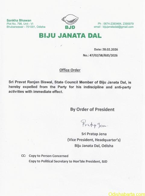Bhubaneswar,( 28/02/2026):The expulsion order, issued on February 28, 2026, by the BJD headquarters and signed on behalf of the President by Vice President (Headquarters) Pratap Jena, cites Biswal’s actions as detrimental to party discipline. Biswal, a State Council Member of the BJD, has been a vocal critic of the party’s recent Rajya Sabha candidate selections.