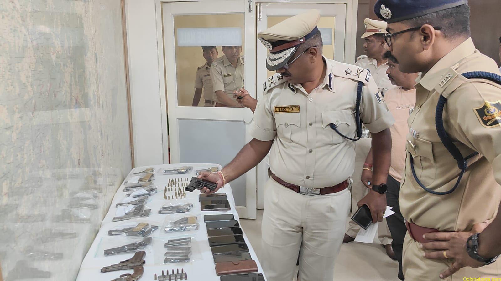 Aska: 3 pistols, 12 live rounds, 4 mobile phones.Bhanjanagar: 1 country-made 7.62 mm gun, 1 magazine, 1 live round of 7.62 mm ammunition.