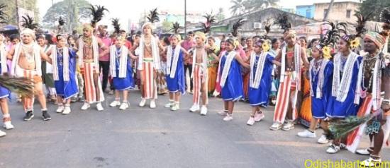 Rayagada, December 27: Rayagada district Lok Mohatsav Chaiti was inaugurated ast Friday with much pomp and show at the local Govinda Chandra Deb(GCD) High School grounds. Under the supervision of District Magistrate Ashutosh Kulkarni, Rayagada presiding deity Maa Majighariani and the Lord of the Universe Shri Jagannath, accompanied by a procession of Kalas, garlands and mashals, were taken out by thousands of people adorned by traditional folk dances and cultural music. After completing the Nagar Parikrama, the jamboree reached the GCD grounds Chaiti Mandap. Maa Majighariani was then worshipped on the stage along with the Chaturdha idols.