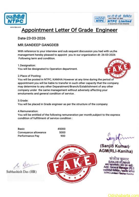 Bureau,Odishabarta NTPC Talcher Kaniha,(02/04/2-26):It has come to notice of NTPC Kaniha management that a forged appointment letter is being issued to people by some unscrupulous elements by forging the signature of senior officials of NTPC.