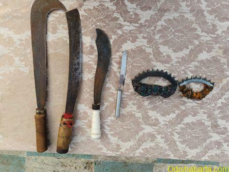 Ganjam,18/01/24:On,last Monday(15.01.2024) at 07.00 PM,while the Badagada police team lead by ASI Kiran Kumar Boxi performing Patrolling/MV checking they noticed three persons sitting in one two wheeler. On suspect Police stopped them for MV checking and being searched. Most surprisingly, they found with local weapons like two numbers of Kati covered in a cloth and one knife and one kati wrapped in a cloth and two iron punches from them.